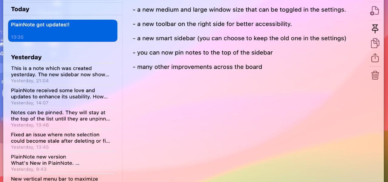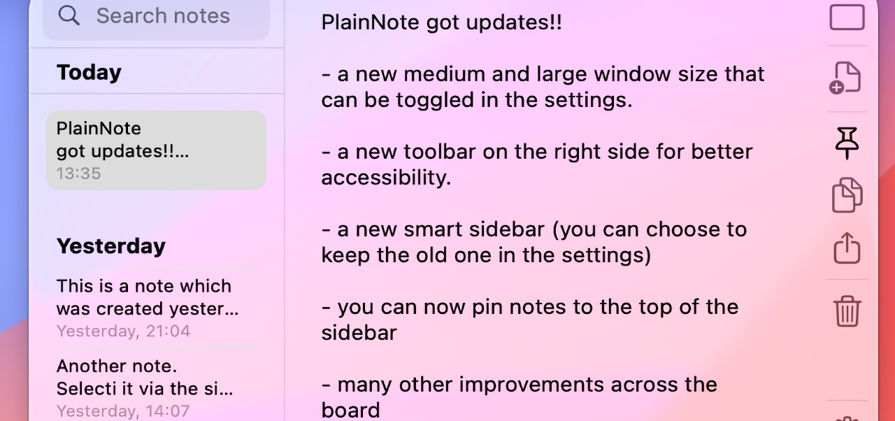- Quickly copy the whole note via button or by pressing <Shift> + <Cmd> + C